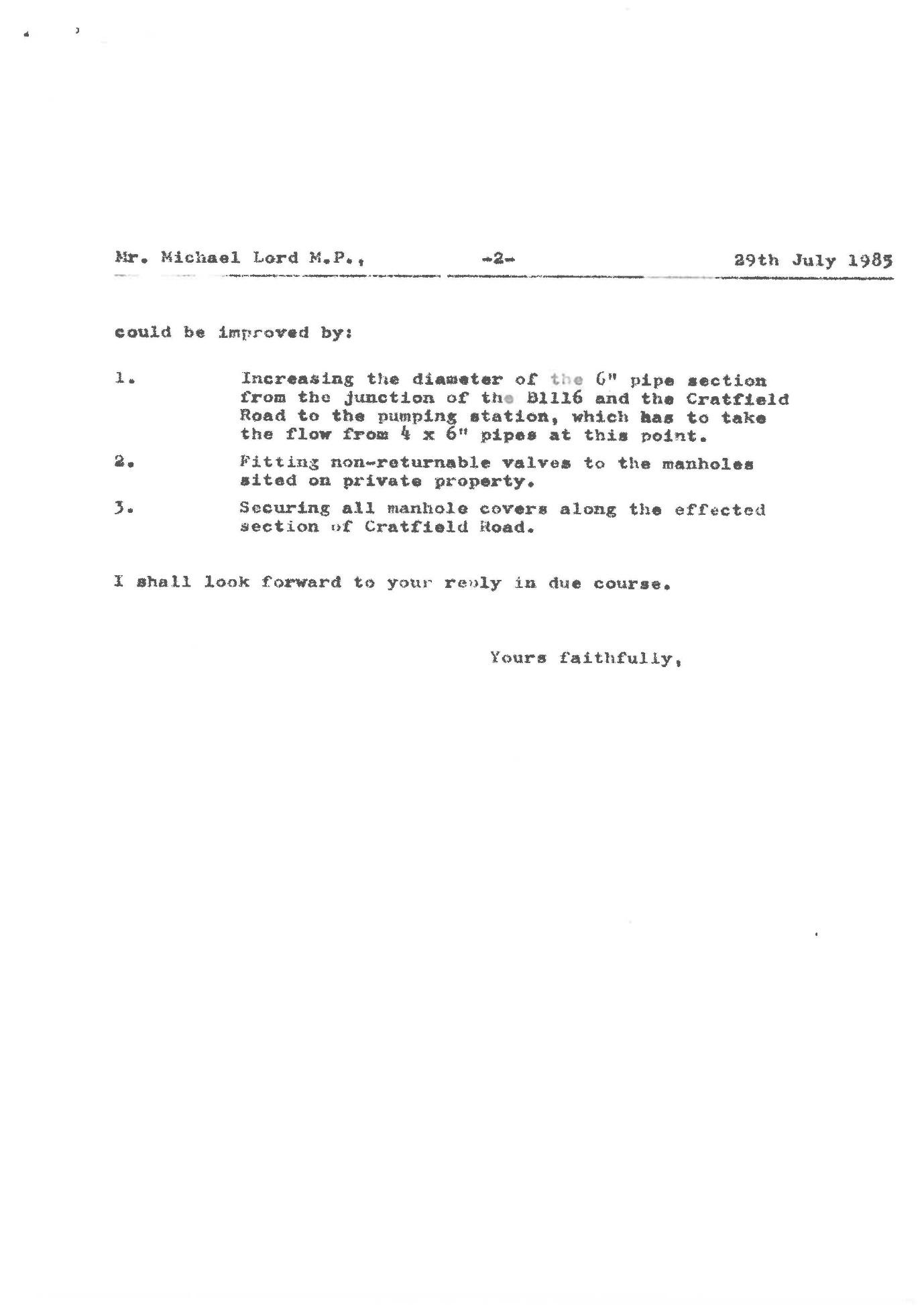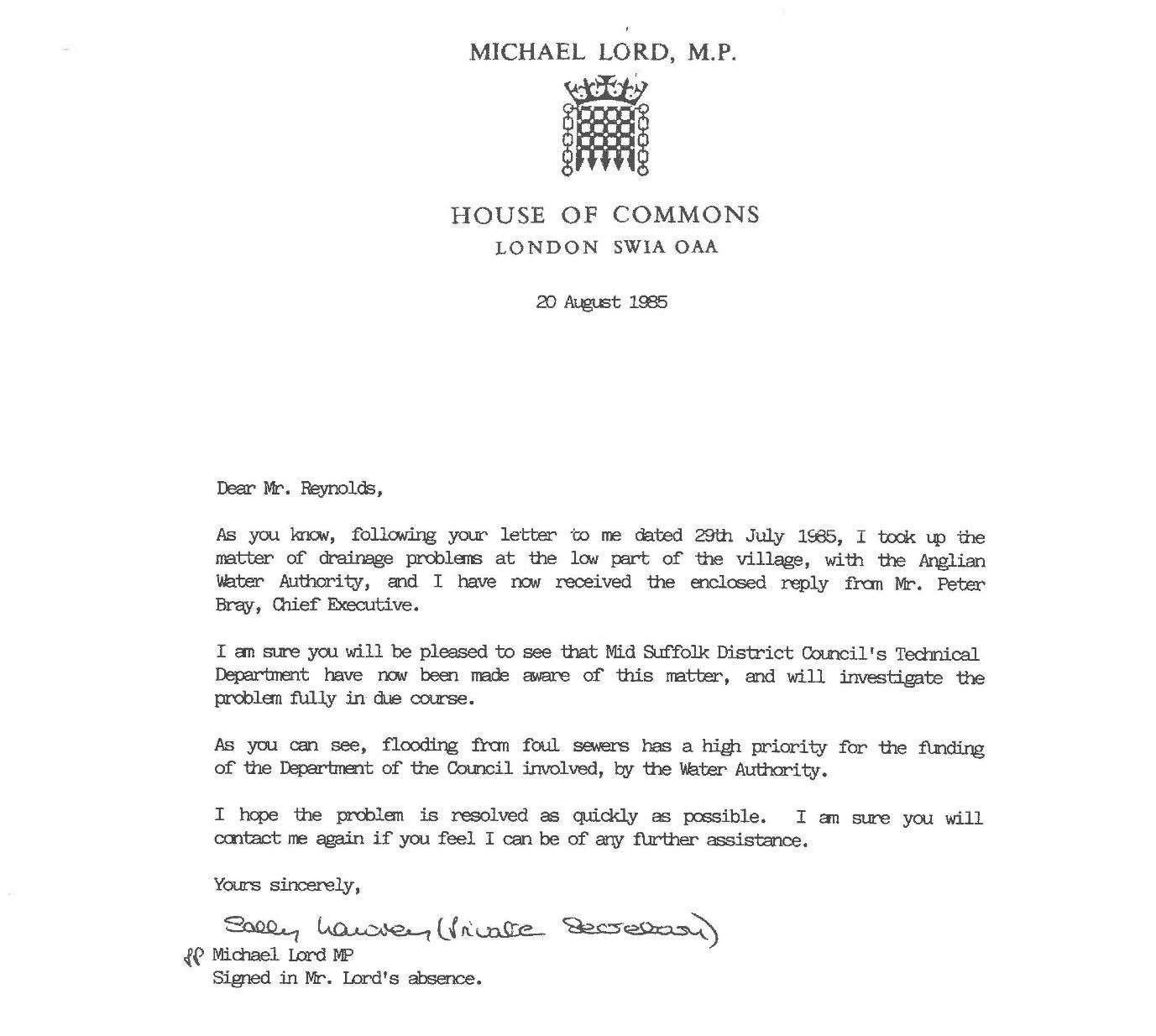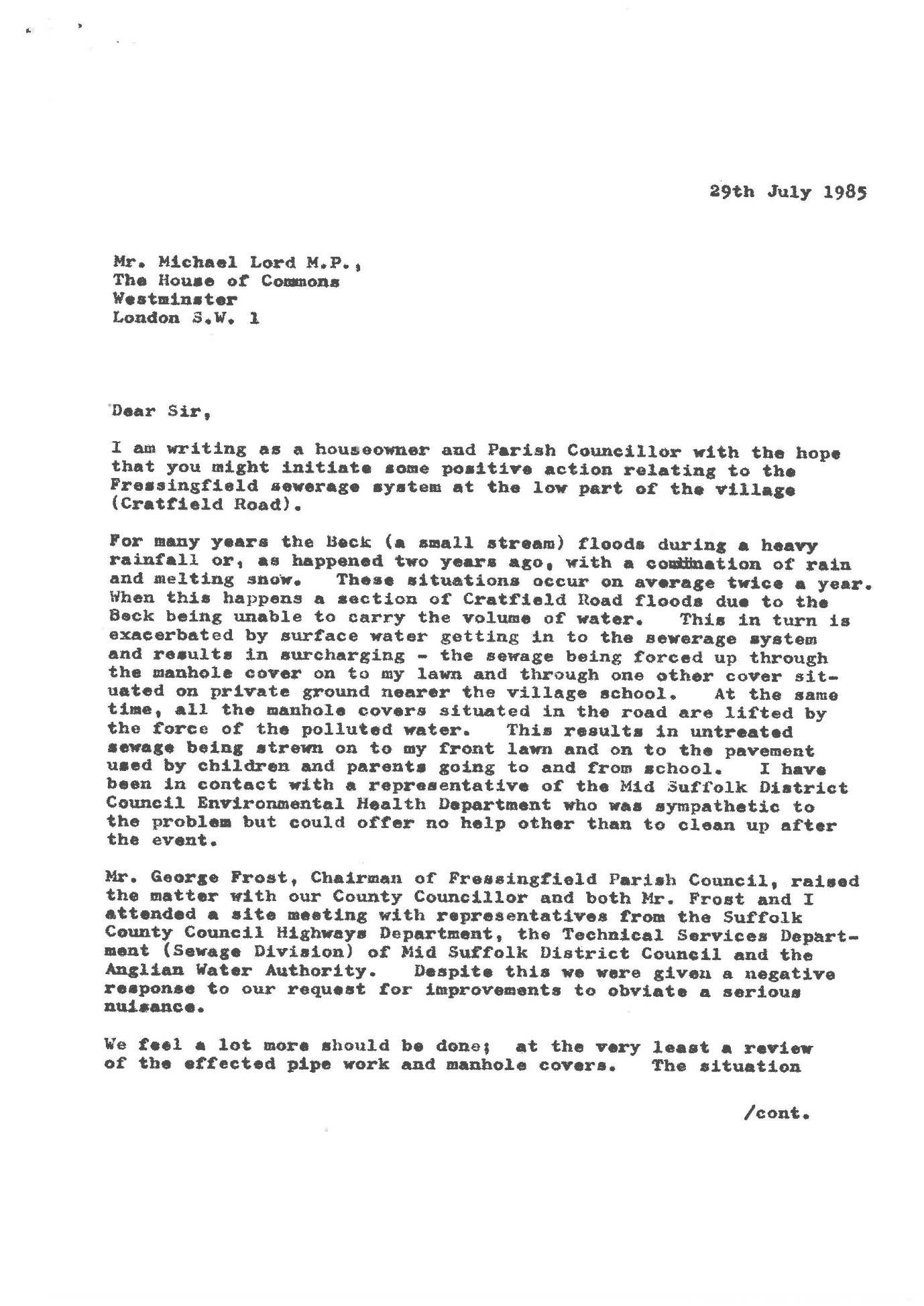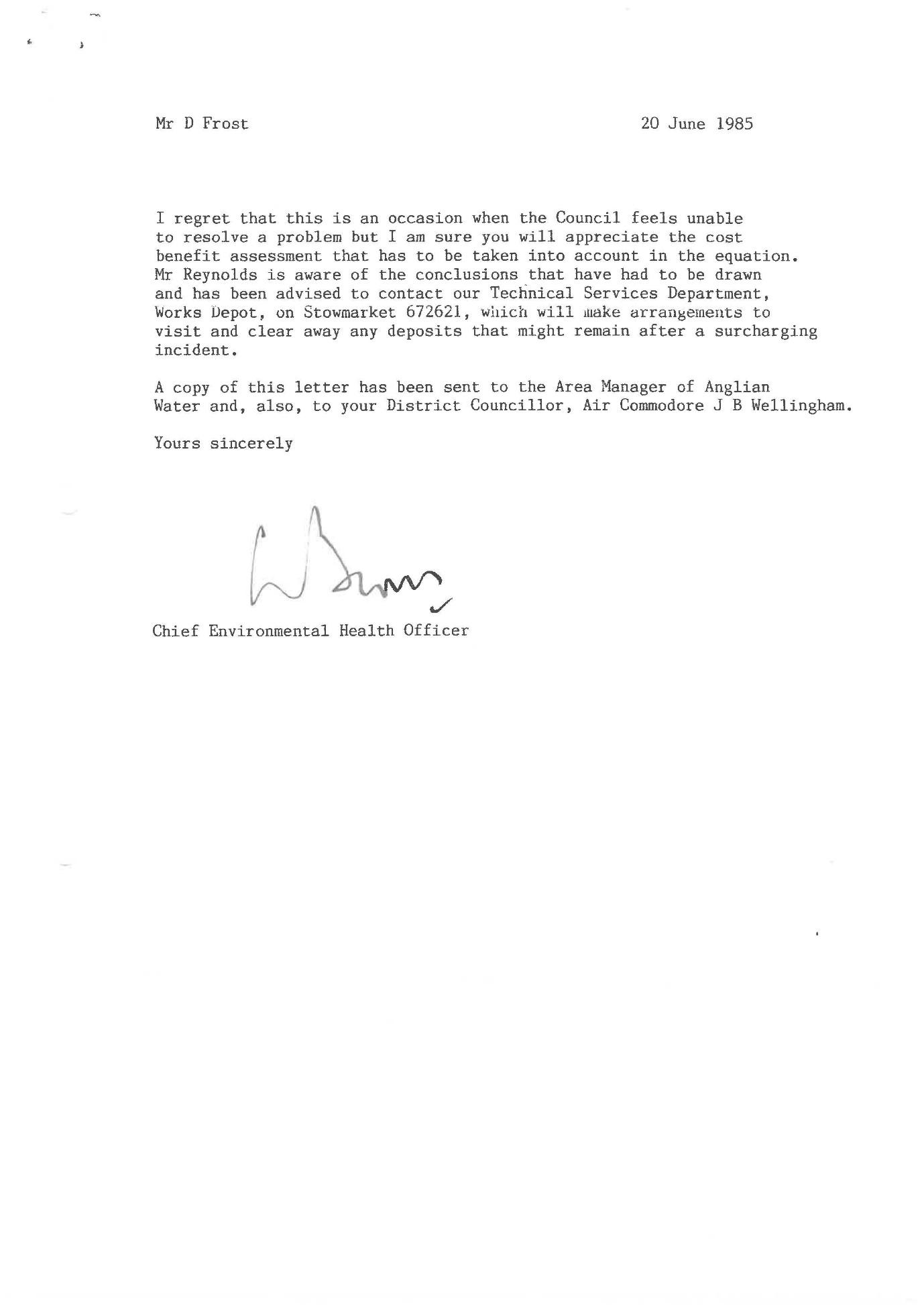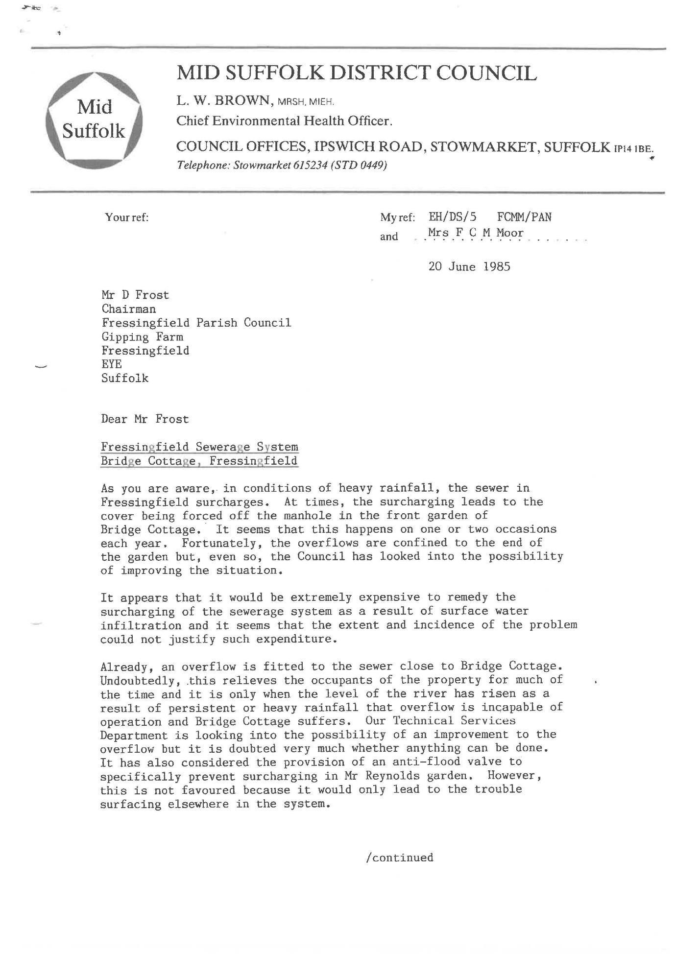 Overflow of the foul only sewer is first formally recorded in 1985 in correspondence between Norman Reynolds (of Bridge Cottage Low Road), the local MP (Michael Lord), the then Chief Executive of Anglian Water (Peter Bray), and Mid Suffolk District Council, acting as the agent for Anglian Water.
